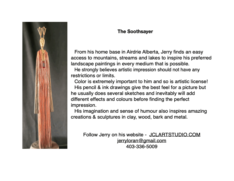 Categories: All LANDSCAPES FRESH IMPRESSIONS BIRDS AND ANIMALS BIRDS AND ANIMALS SCULPTURES WOOD SCULPTURES DIAMOND WILLOW CANES VINTAGE BUILDINGS All | LANDSCAPES | FRESH IMPRESSIONS | BIRDS AND ANIMALS | SCULPTURES | WOOD SCULPTURES | DIAMOND WILLOW CANES | VINTAGE BUILDINGS | City Scape.... Sold Sold out Natures Fluorescence Luminous Driftwood Sculpture Blue Driftwood Bench Burl Tables. ( works in progress) Sold out BurgundyDriftwood Table SOOTHSAYER THE FLAMES WHERE THE TRAIL SPLITS THE OLD FENCE SEPTEMBER GOLD PINE GHOSTS WILD WILLIE Sold out THREE AMIGOS HIGH WATER STRUTTING MY STUFF TUCO - WOODY ( SOLD ) KOKO CLUB FOOT ( SOLD ) Sold out The Sentinal COLOUR & TEXTURED DETAILING. NFS Sold out SNOW COVERED ROCK WALL TALL ASPENS IN THE FALL BLUE HILLS ASPEN LONG BRANCH THE SUN SHINES THROUGH FIRE IN THE SKY Greener On the Other Side SOFT & RELAXING THROUGH THE REEDS BACK IN TIME HOT SUMMER DAY RIVER AT MARBLE CANYON. (reserved) Sold out DRIVE IN THE FOOTHILLS 06/99 KOOTENAY RIVER (reserved) Sold out RED BARN RED STABLE BOWRIVER. INLET "NFS" Sold out THE OLD BARNS NFS Sold out FAIRWAY "NFS" Sold out OPEN THE GATE NFS Sold out OVER THE BLUE HORIZON NFS Sold out SPRING IS HERE. SOLD Sold out REFLECTIONS COTTONWOODS KANANASKIS POND. NFS Sold out SITTING BULL SCULPTURE CROWFOOT. SCULPTURE GREAT SPECKLED BIRD - (not available) Sold out WALKING STICK. # 9 WALKING STICK #8 WALKING STICK #7 WALKING STICK. #6 WALKING STICK #5 WALKING STICK #4 WALKING STICK #3 WALKING STICK #2 WALKING STICK. #10 WALKING STICK. #1 EAGLE. RIDGE. SUN UP. NFS Sold out BOW RIVER - COCHRANE RAPTOR. # 1 RAPTOR. 2 COLORFUL BUT NOT HAPPY ABOUT IT I'M WATCHING YOU. NFS/SOLD Sold out GRAZING. BUFFALO. *SOLD SENTINEL COMMISSIONED SHEEP DOG. NFS Sold out GRIZZLEY. NFS Sold out ON THE PROD LONGHORN PRIDDIS. GRAINARIES FALL LANDSCAPE WITH 3D BARK ACCENT. OCTOBER AFTERNOON SPRING RUN OFF WINTER IS JUST ABOUT HERE SPARCE YET SPECTACULAR FALL IS COMING BIRD PERCH COMMISSIONED WOOD CARVING. - NFS Sold out BIRD PERCH. BIRD PERCH COMMISSIONED WOOD STATUE. NFS Sold out BRONZED RANCHER COMMISSIONED ATHLETE NFS Sold out COMMISSIONED WOOD STATUE NFS Sold out WOOD SPIRIT COMMISSIONED WOOD CARVING. NFS Sold out MUSHROOMS. BIRD PERCH THREE STORY VIEW ON THE BEACH ANIMAL RANCHSCAPES Sold out EYES ON YOU. (NFS) Sold out A LONELY CALF NFS Sold out RACE HORSE- SOLD LONGHORN FAMILY PET Sold out MOUNTAIN TRYPTIC FOREST GLEN END OF A BEAUTIFUL DAY SO BRIGHT LONE PINE Sold out SHADES OF BLUE WHITE FLOWERS &. ASPENS MYSTERY ROCK RIDGE MY PIECE OF HEAVEN RED BARN RED STABLE ROUND GRAINERIES AROUND THE BEND FIRE IN THE SKY LONG WALK HOME EDGE OF THE FOREST BIRCHES IN THE FALL COTTON CANDY FALL THE THREE SISTERS NFS. (Gifted) JAKES PLACE ALPINE TRAIL DUSK MOUNTAIN MEADOW MOUNTAIN MEADOW STEPPING STONES Aspens on the Eastern Slopes Alpine Pass